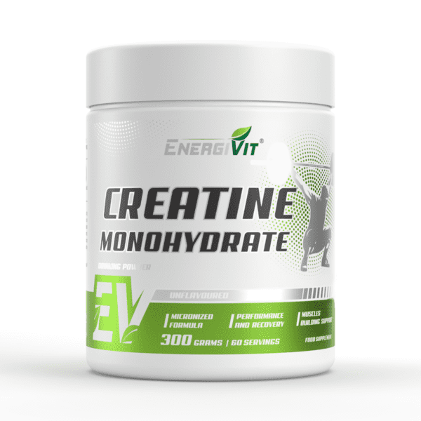 EnergiVit Creatine Monohydrate / 300 g (Креатину 94%) – дієтична добавка, що містить чистий моногідрат креатин. Рекомендовано приймати всім, хто веде активний спосіб життя та займається різними видами спорту. Сприяє підвищенню сили та витривалості на тренуваннях за рахунок швидкого відновлення рівня АТФ у м’язах. АТФ (аденезінтрифосфат) – універсальне внутрішньоклітинне джерело енергії для нашого організму.